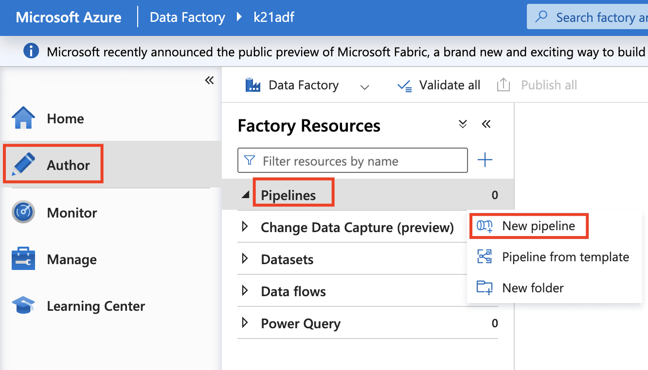 1) Select the Author, and then select Pipeline and add New pipeline.