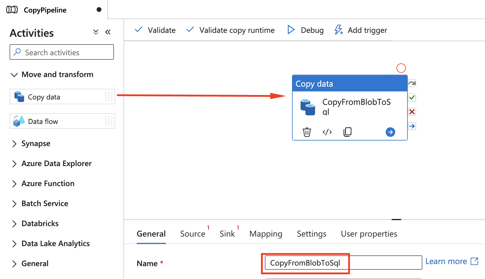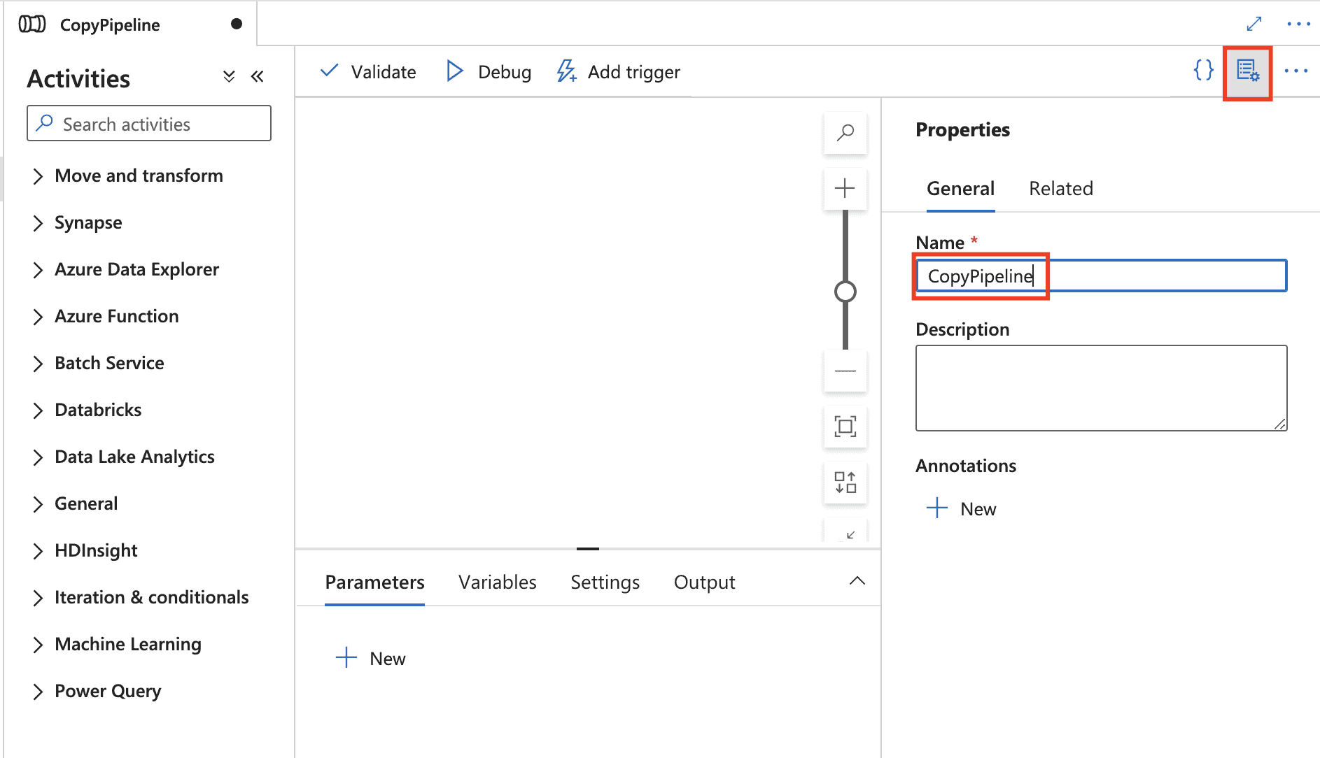 2) In the General panel under Properties, specify CopyPipeline for Name. Then collapse the panel by clicking the Properties icon in the top-right corner.