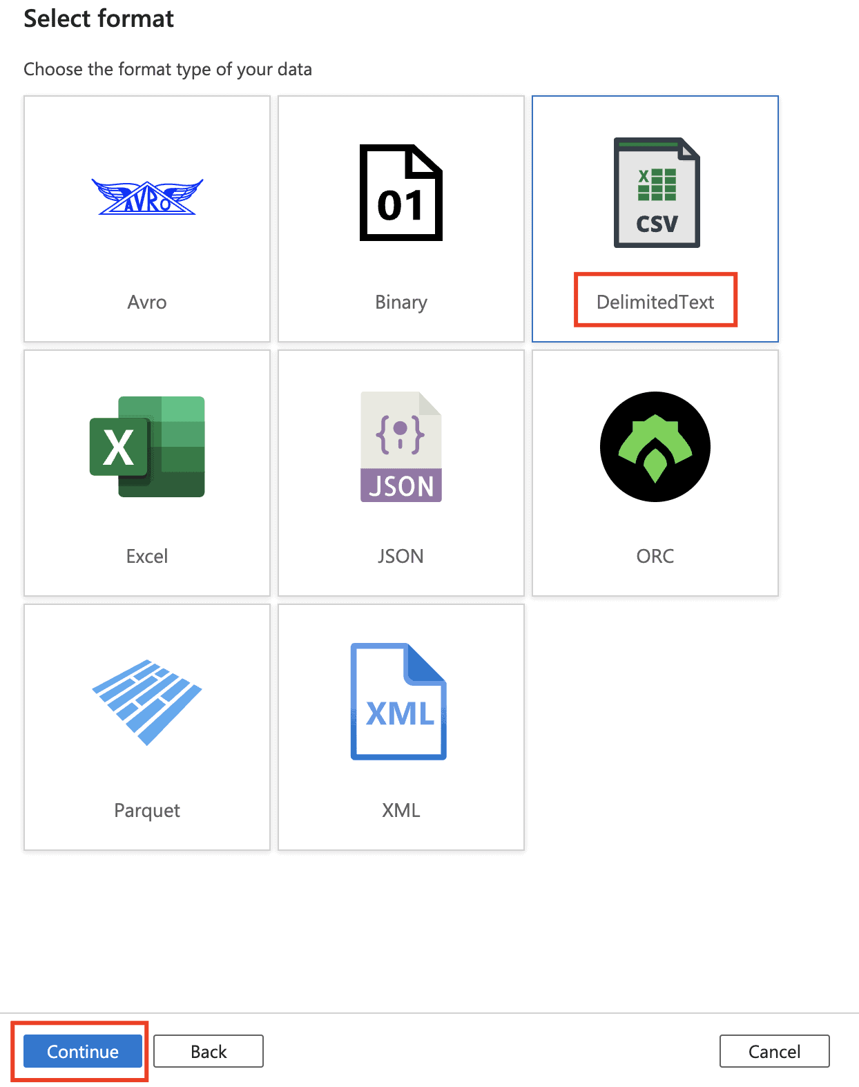 6) In the Select Format dialog box, choose the format type of your data, and then select Continue.