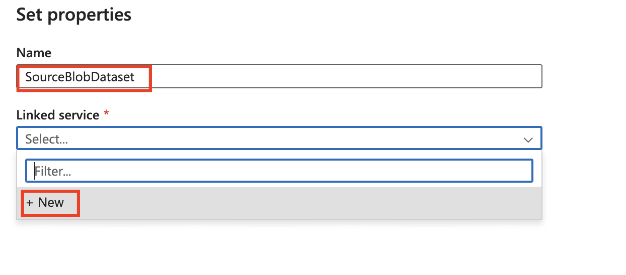 7) In the Set Properties dialog box, enter SourceBlobDataset for Name. Select the checkbox for the first row as a header. Under the Linked service text box, select + New.