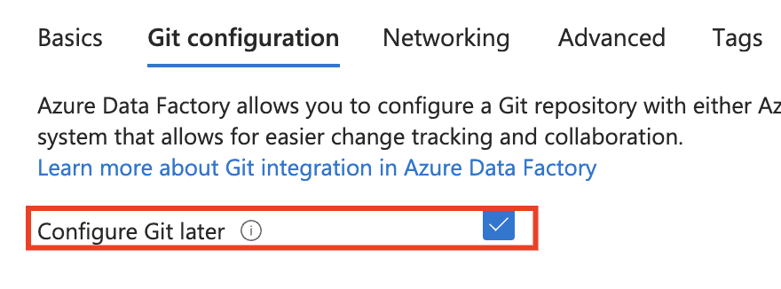 4) On the Git configuration page, select the check box, and then Go To Networking. Then select Review+Create