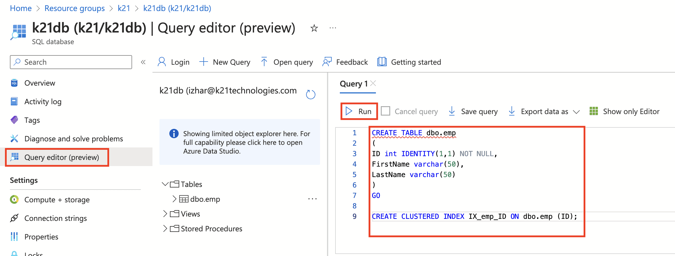 4) Create a sink SQL table, Use the following SQL script to create a table named dbo.emp in your SQL Database.