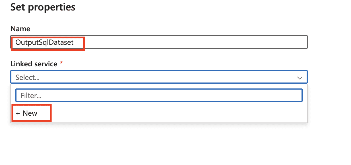 12) In the Set Properties dialog box, enter OutputSqlDataset for Name. From the Linked service dropdown list, select + New.