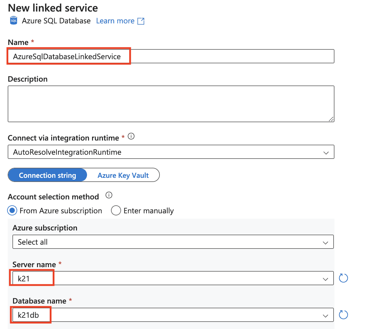 15) On the New Linked Service (Azure SQL Database) Page, Select Test connection to test the connection. Then Select Create to deploy the linked service.
