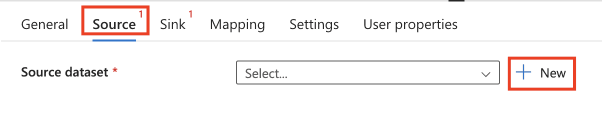 4) Go to the Source tab. Select + New to create a source dataset.