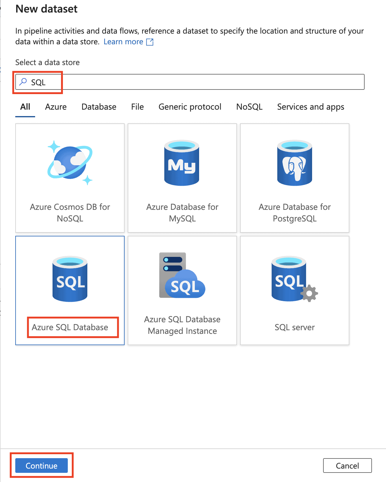 In the New Dataset dialog box, input “SQL” in the search box to filter the connectors, select Azure SQL Database, and then select Continue.