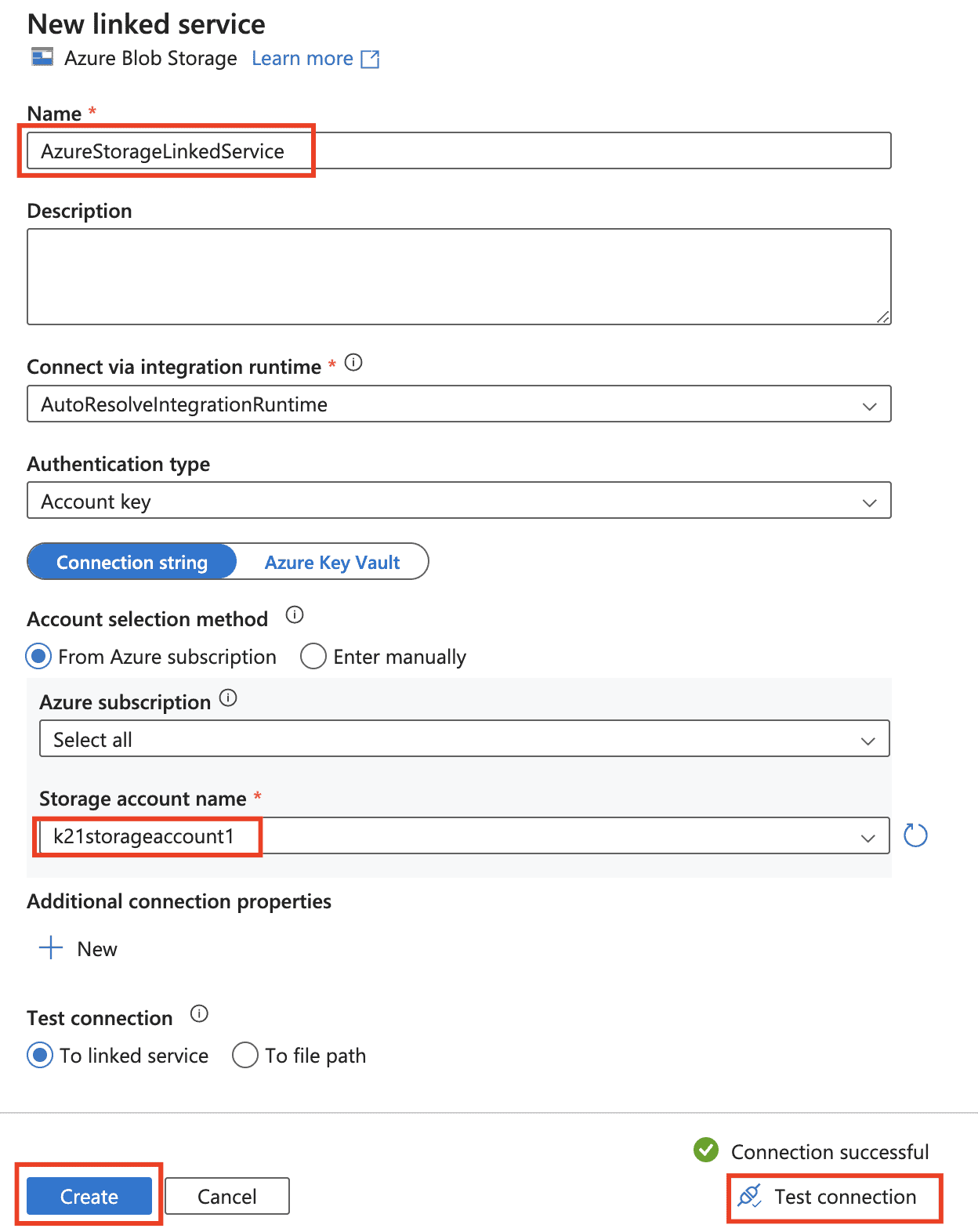 8) In the New Linked Service (Azure Blob Storage) dialog box, enter AzureStorageLinkedService as name, select your storage account from the Storage account name list. Test connection, select Create to deploy the linked service.