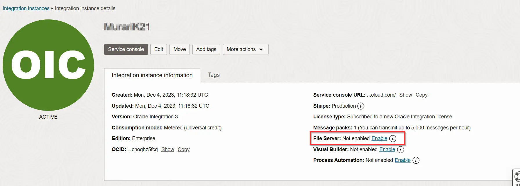 - Enable File Server to Use OIC-Provided FTP Server: In The Integration Instance Just Click On The Enable File Server