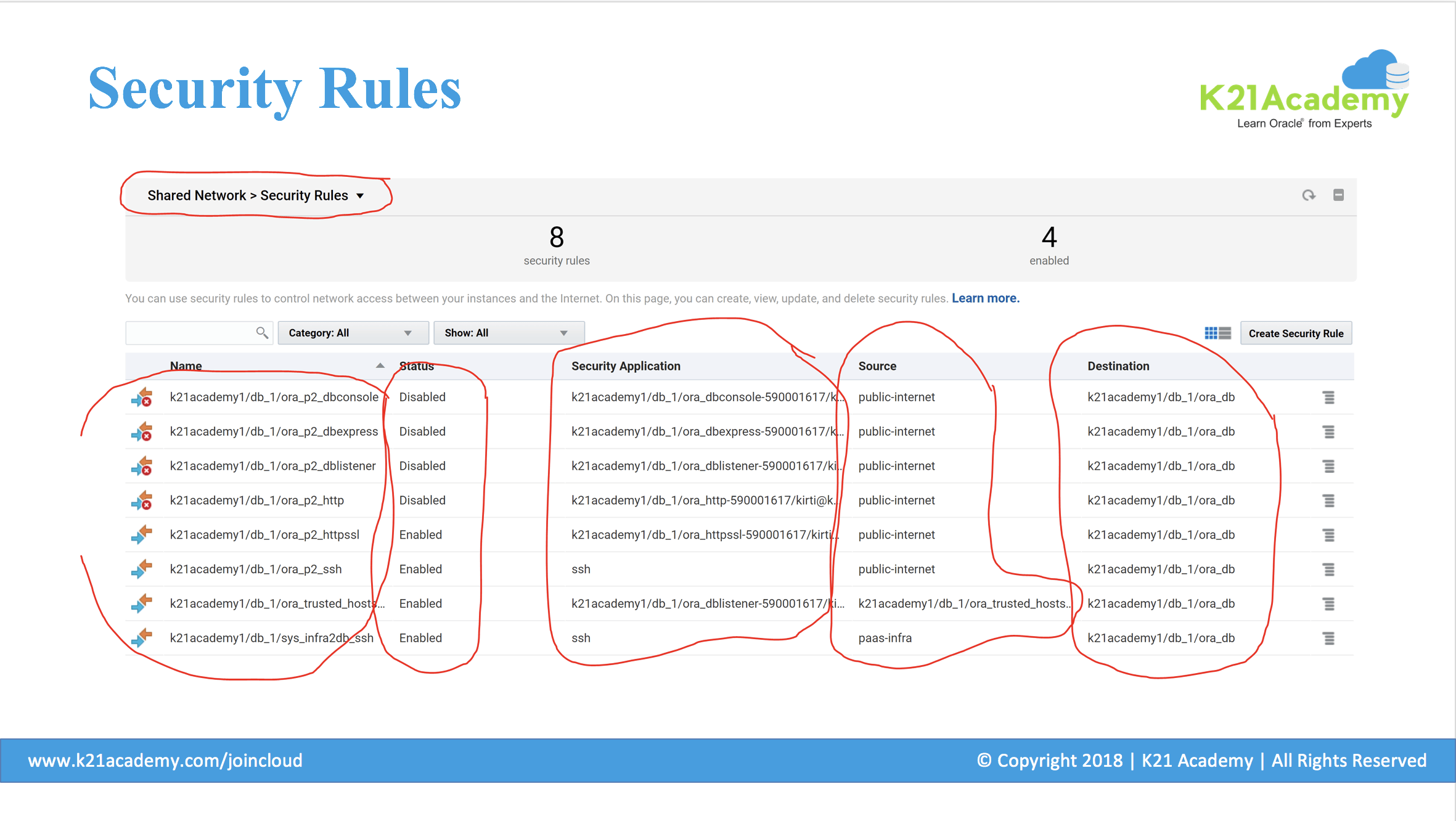 6. Security/Firewall/Network: As you get full access to DBCS instance, you also get access to control who can access what and from where.This is done using Security Rules, Security Applications, Security List & Security IP List