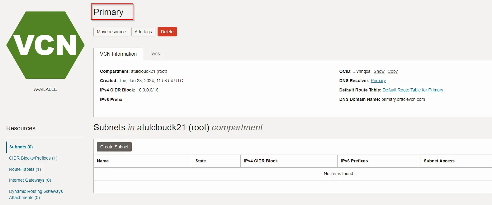 - Create VCN(with resources) on both compartment Root and Secondary Compartment.
