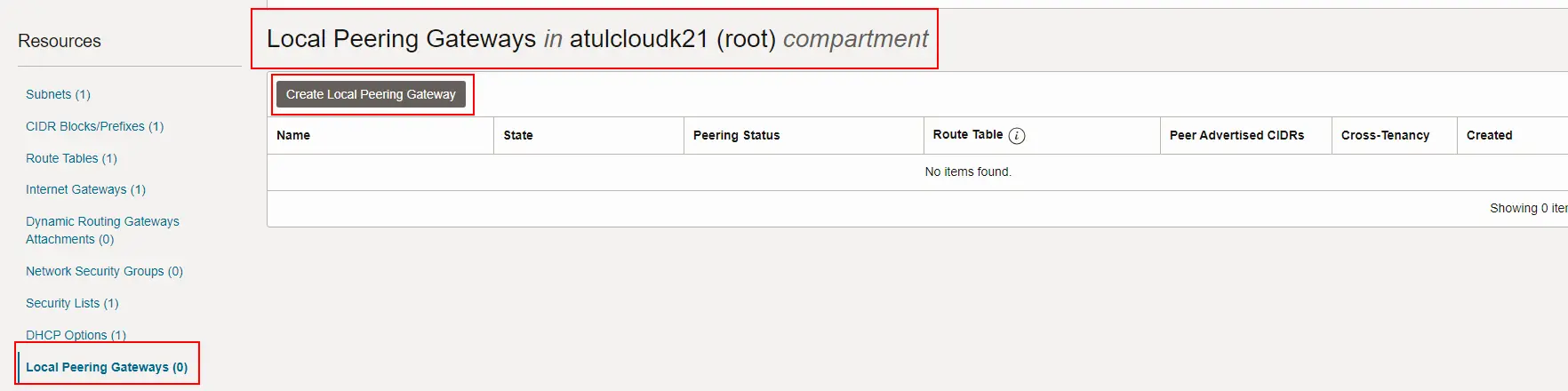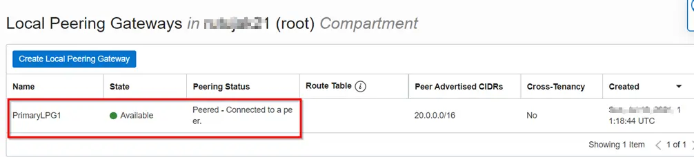 Step 2: Creating a Local Peering Gateway in both compartment