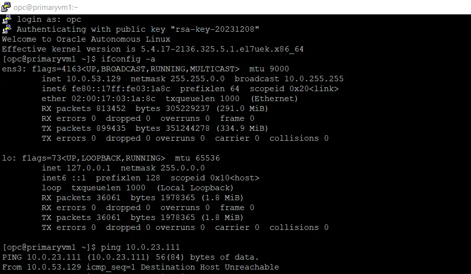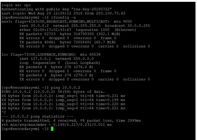 - Login into PrimaryVM1 as opc user and ping the private IP address of the SecondaryVM1 you should be able to see the packet response from SecondaryVM1.