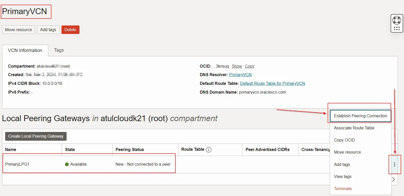 - After creating the LPG, navigate to the VCN with which you want to establish peering.
