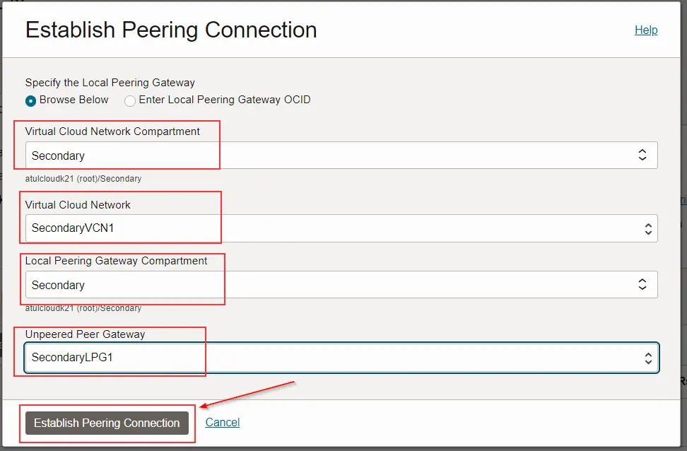 - Provide a name for the LPG and select the VCN associated with it. (Create LPGs on Both VCN, which you have created in Root compartment and Secondary compartment)
