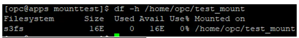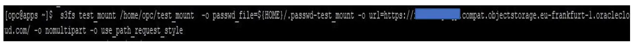 s3fs [Bucket_Name] [Mount_Directory] -o endpoint=[Region] -o passwd_file=${HOME}/.passwd-s3fs -o url=https://[namespace].compat.objectstorage.[region].oraclecloud.com/ -onomultipart -o use_path_request_style