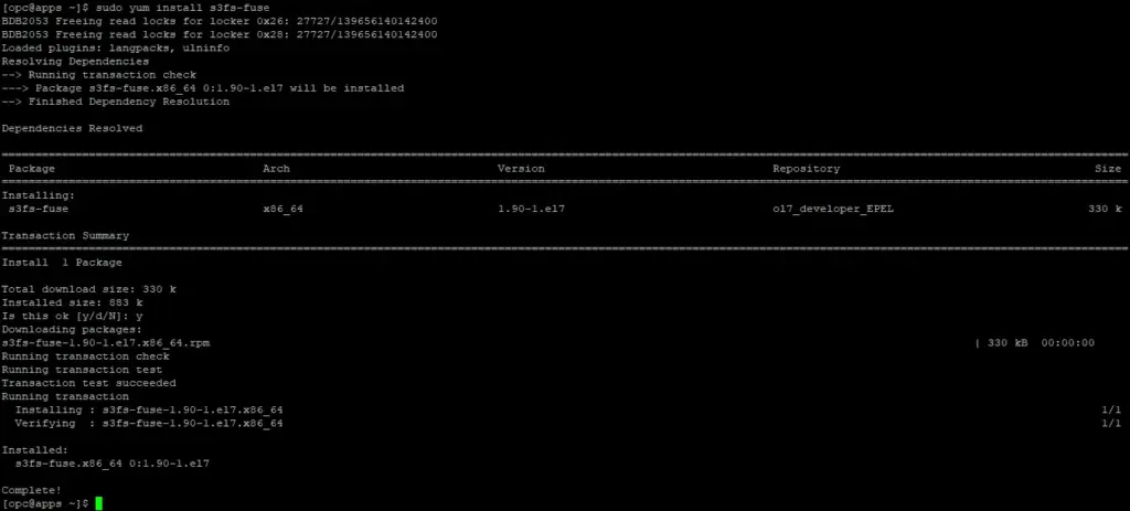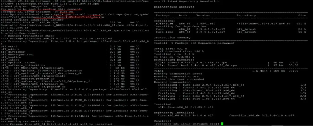 You can install s3fs-fuse either from source or by using a pre-built package from the Oracle Linux EPEL repository. In this post, I’m using Linux EPEL repository.