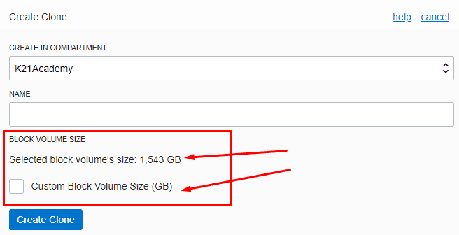 - Now when you do Block Volume clone you will see the extra parameter mentioned which is of size. as shown below.