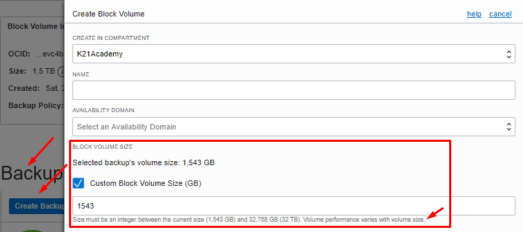 - Next is if you are creating a block volume using the backup you can resize it and while creating volume.
