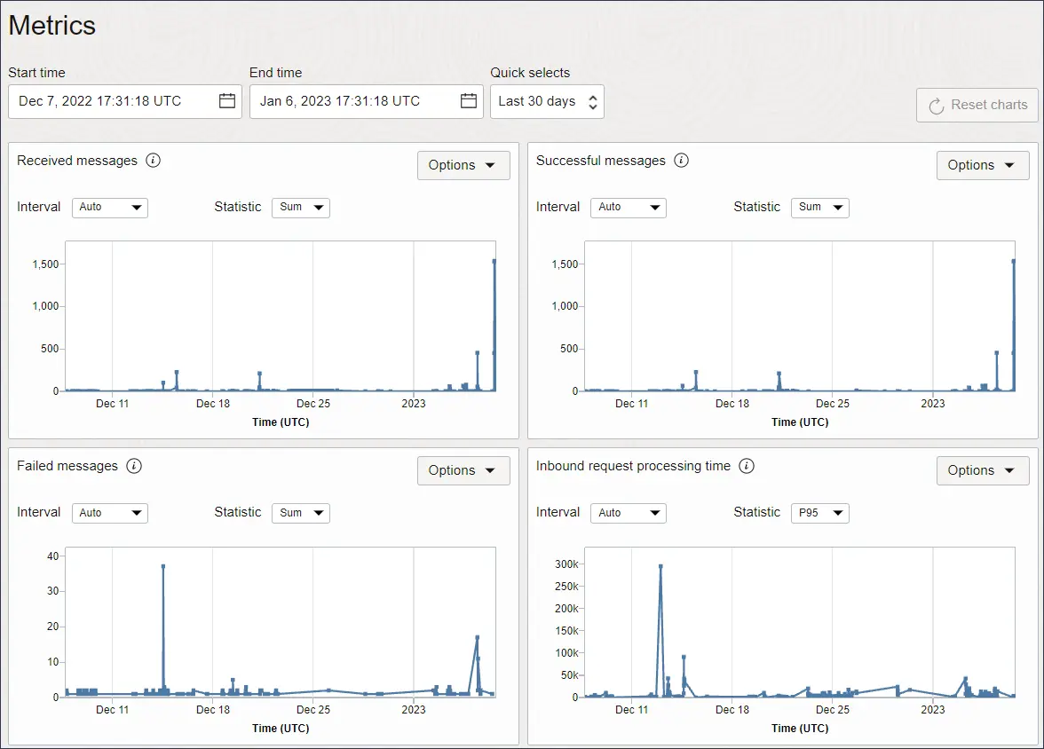 View and analyze message data, processing and invocation times, adapter requests, and configured and consumed messages on the Metrics page. Use the data to monitor resources associated with Oracle Integration and the applications that you integrate with Oracle Integration.