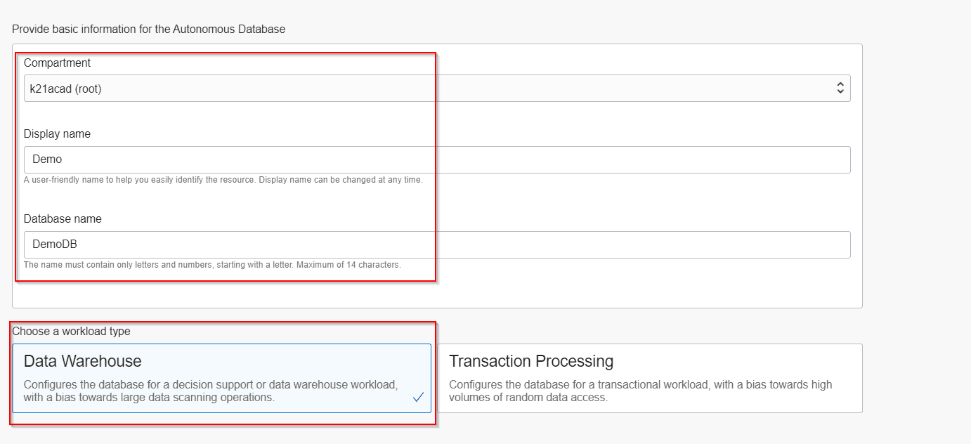 5) Select compartment inside which you want to create the Instance, Enter the Display name and database name and Choose a workload type.
