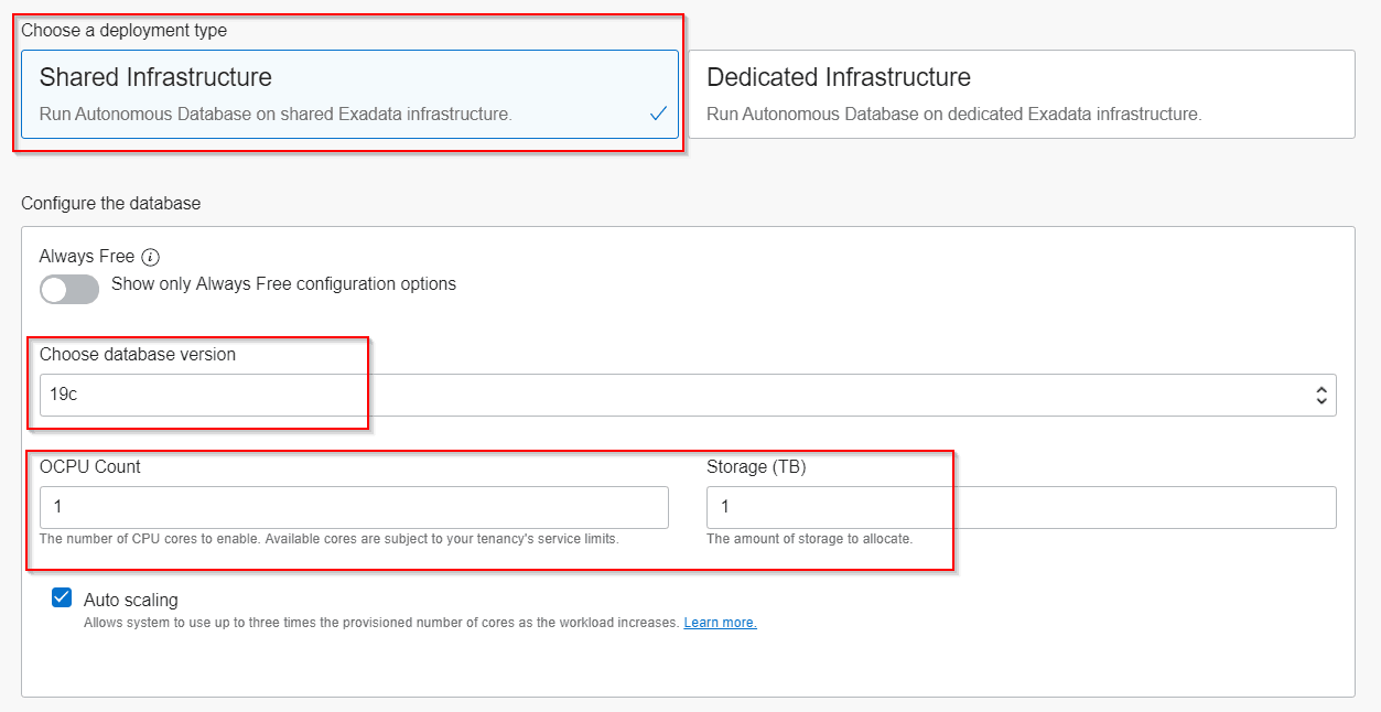 Note: As of April 2020 19c version only available on Shared Infrastructure so select Shared Infrastructure deployment type.
