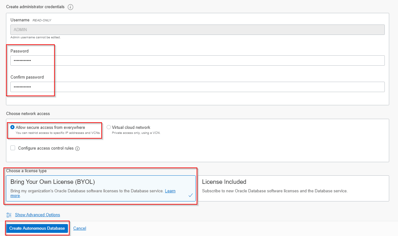 Note: Choose network access As of February 2020 (Shared Infrastructure Only) Autonomous Database Now Supports Private Endpoints by using this it is now possible to restrict access to Autonomous Database by specifying a private endpoint within a Virtual Cloud Network (VCN).